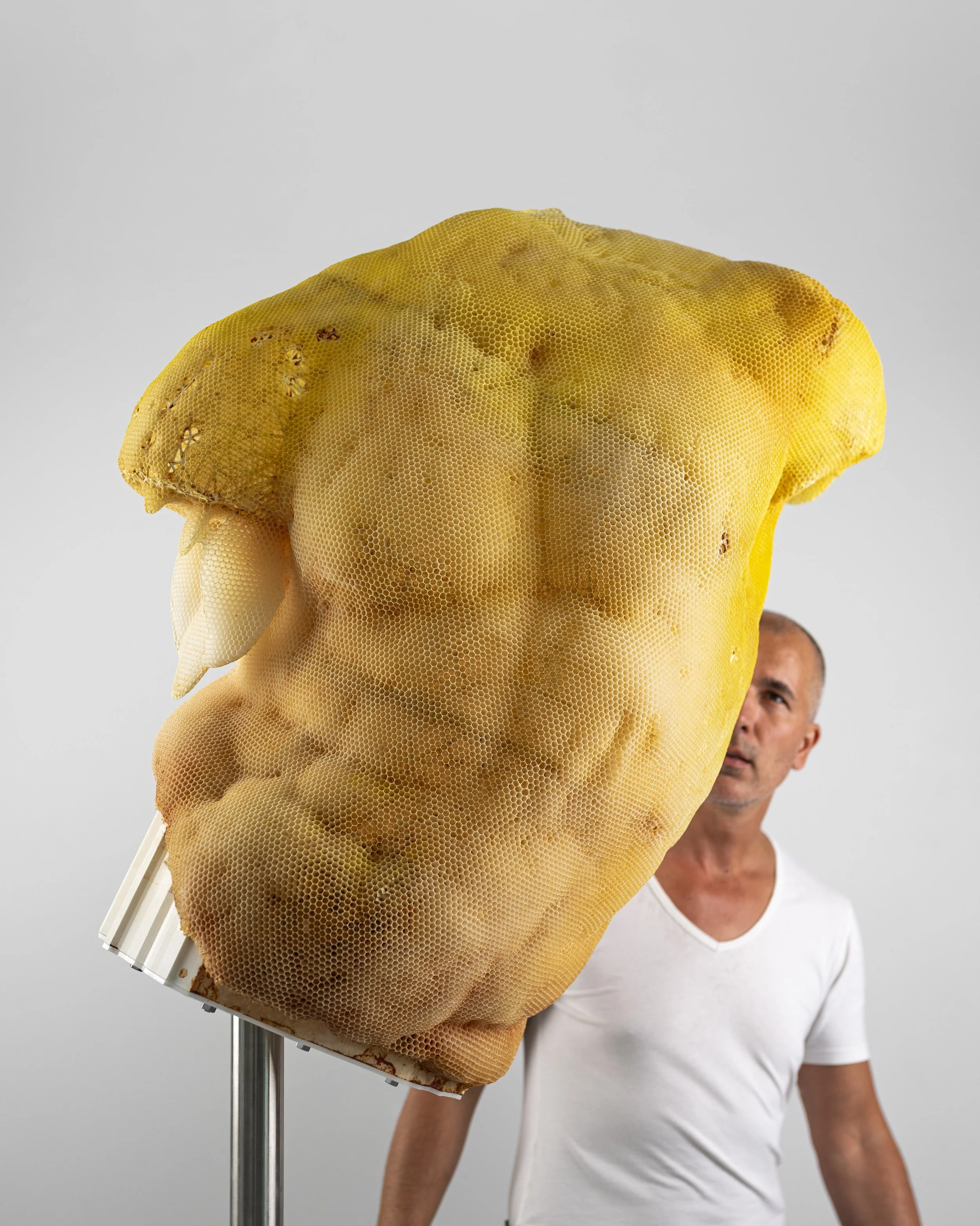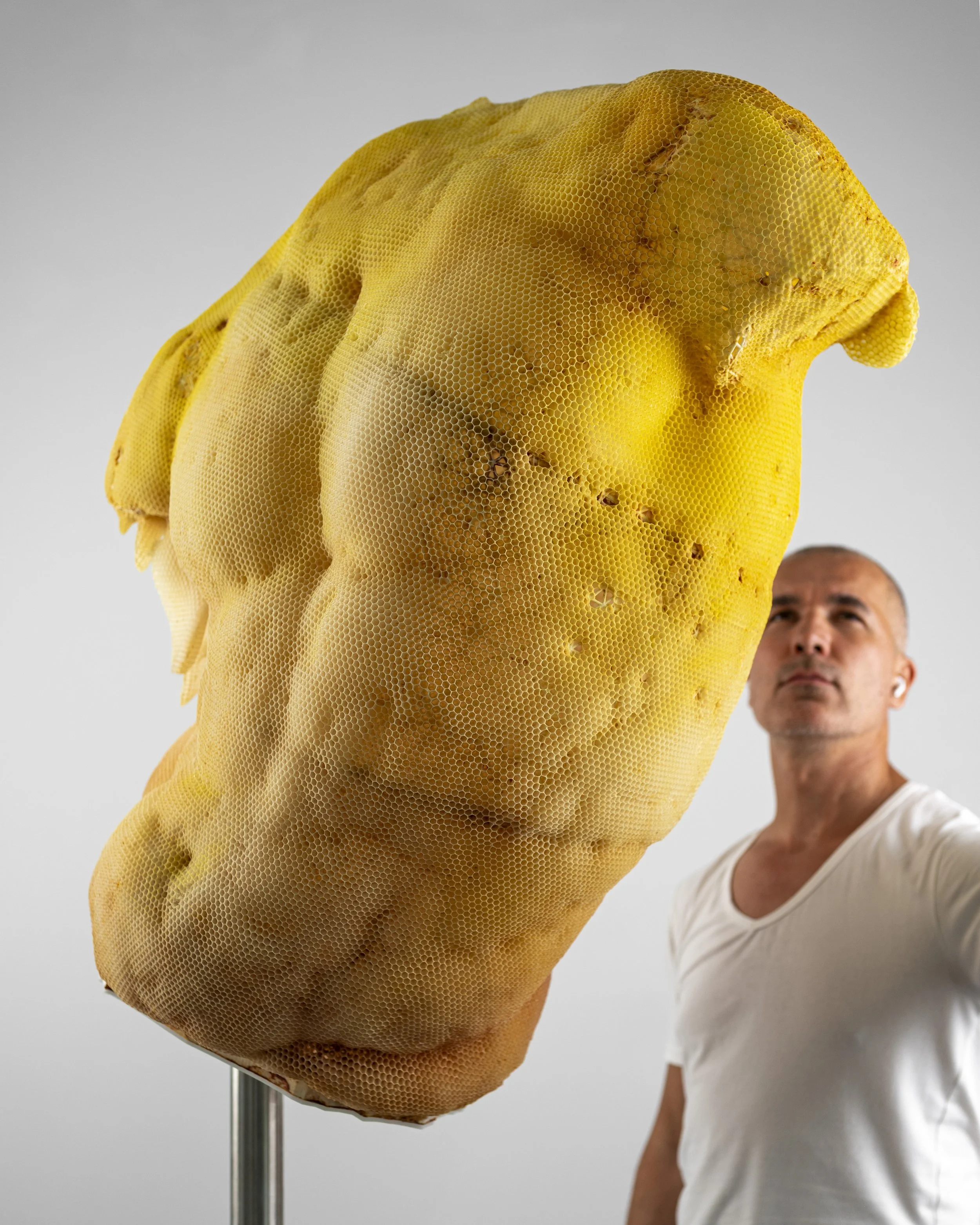 About the work: Based on the famous Gaddi Torso (2nd century BC) from Le Gallerie degli Ufizi in Florence which art historians consider a fragment of a centaur (a creature from Greek mythology with the upper body of a human and the lower body and legs of a horse). This sculpture took two years to make and 120.000 bees. It is the largest single piece made by bees at our Lakeside Bee Farm and possibly the largest sculpture in the world ever made this way.