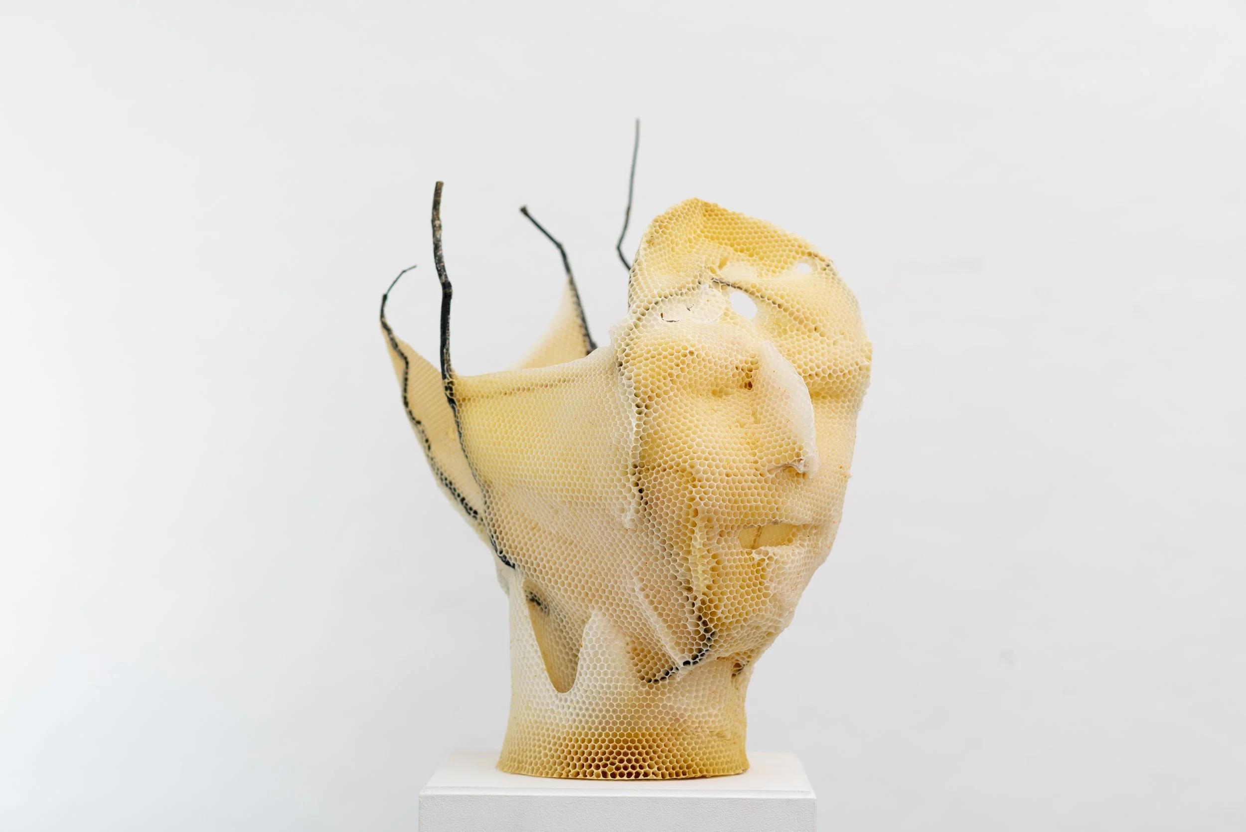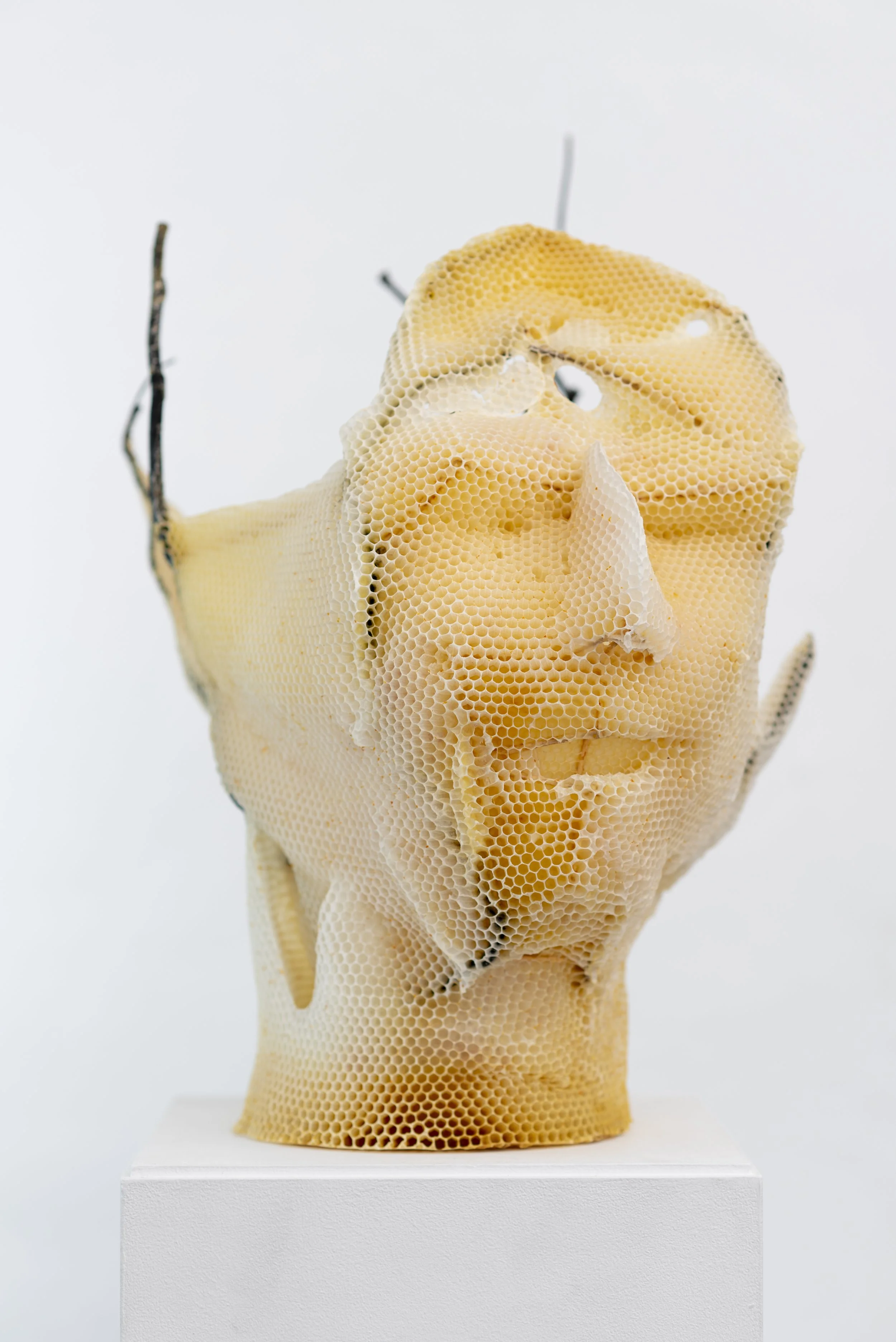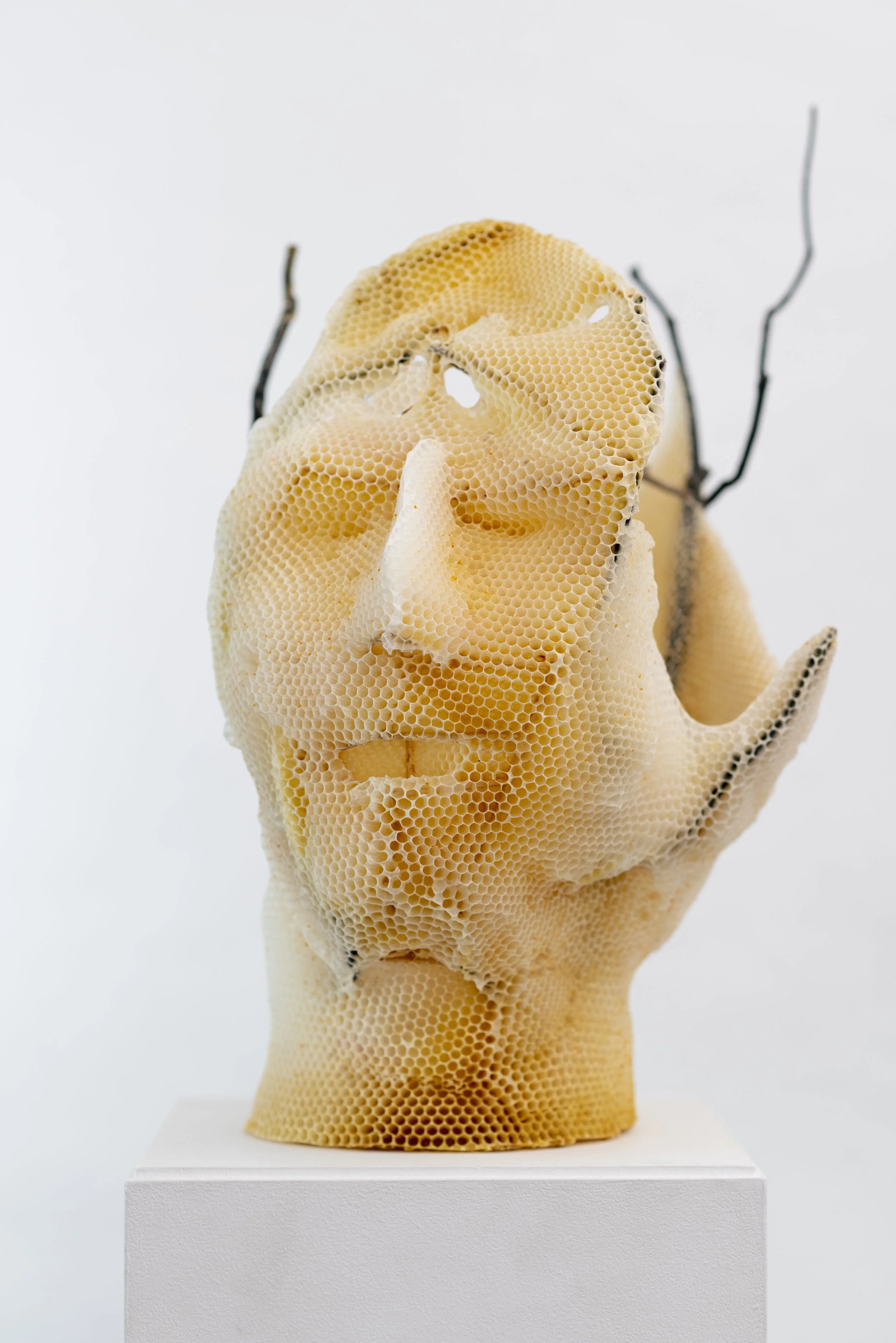 The “made by bees” sculpture is build around hand-made branch framework departing from my previous 3D printed foundations. The rough form of the mould leaves much of the interpretion to what the portrait should look like to mother nature - the colony of honeybees themselves. The result is strangely robust but gentle human face.