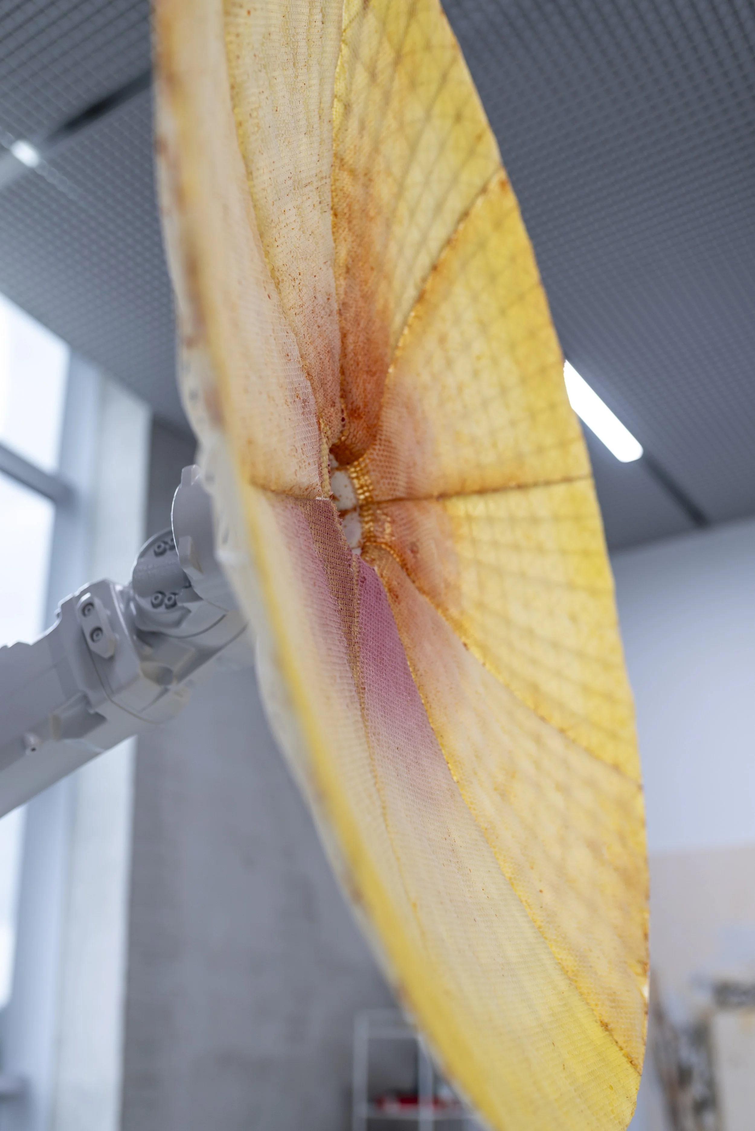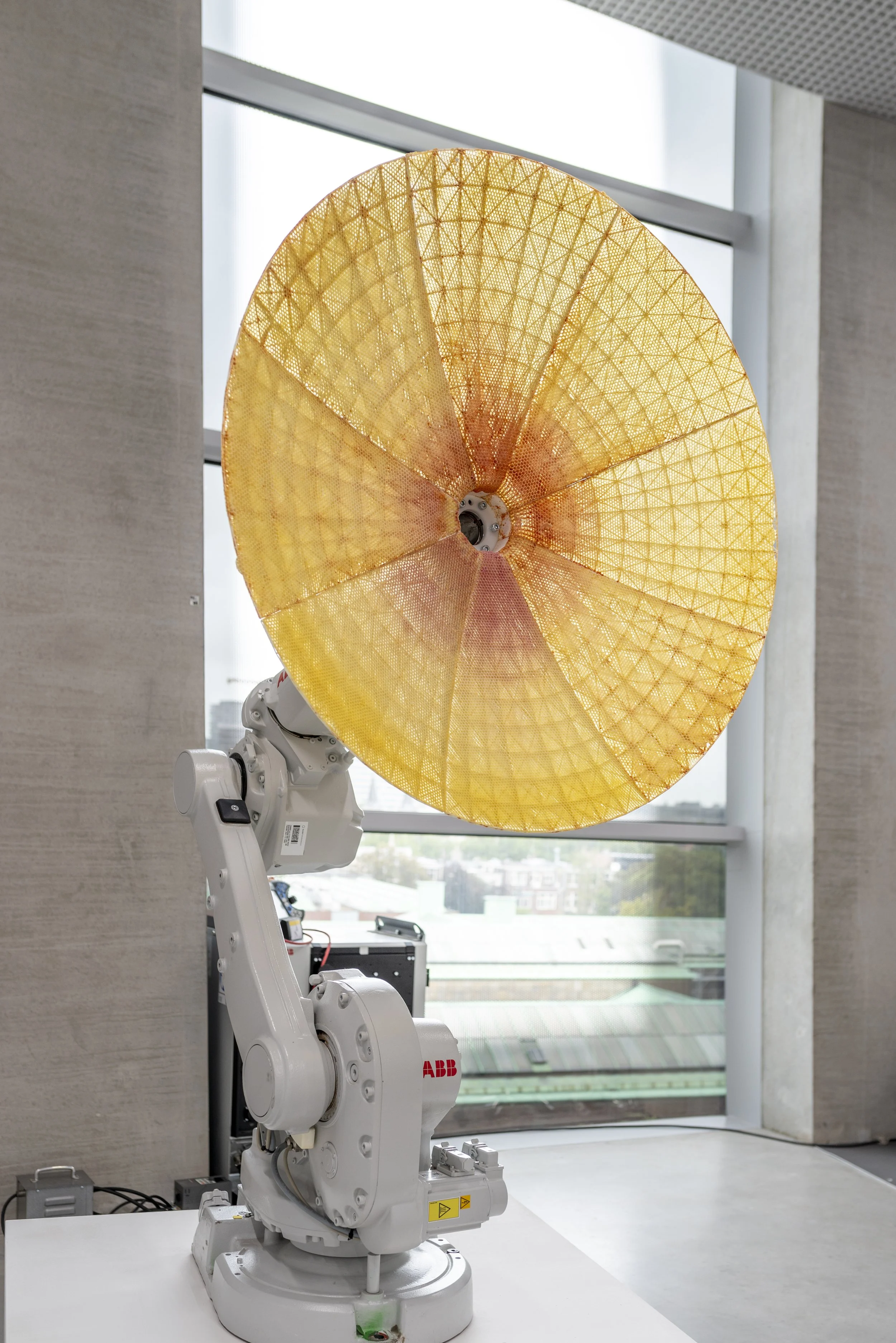 About the work: This large kinetic installation was originally conceived for the 2012 London Olympics but realized in 2024. The satellite dish from made from beeswax is mounted on an industrial robotic arm. The robotic arm moves during the opening hours of the museum. It follows precisely the movement of the Sun as it moves across the sky almost like a sunflower. The honeybees themselves similarly orient themselves using our star as their natural GPS to travel from and back to the beehive. They can see its radiation even during the cloudy days due to their capacity to “see” ultraviolet part of the spectrum. The work is both kinetic performance as well as process based collaboration with nature. It speak volumes about our relationship with nature and technology as well as wider interconnectedness with our universe.