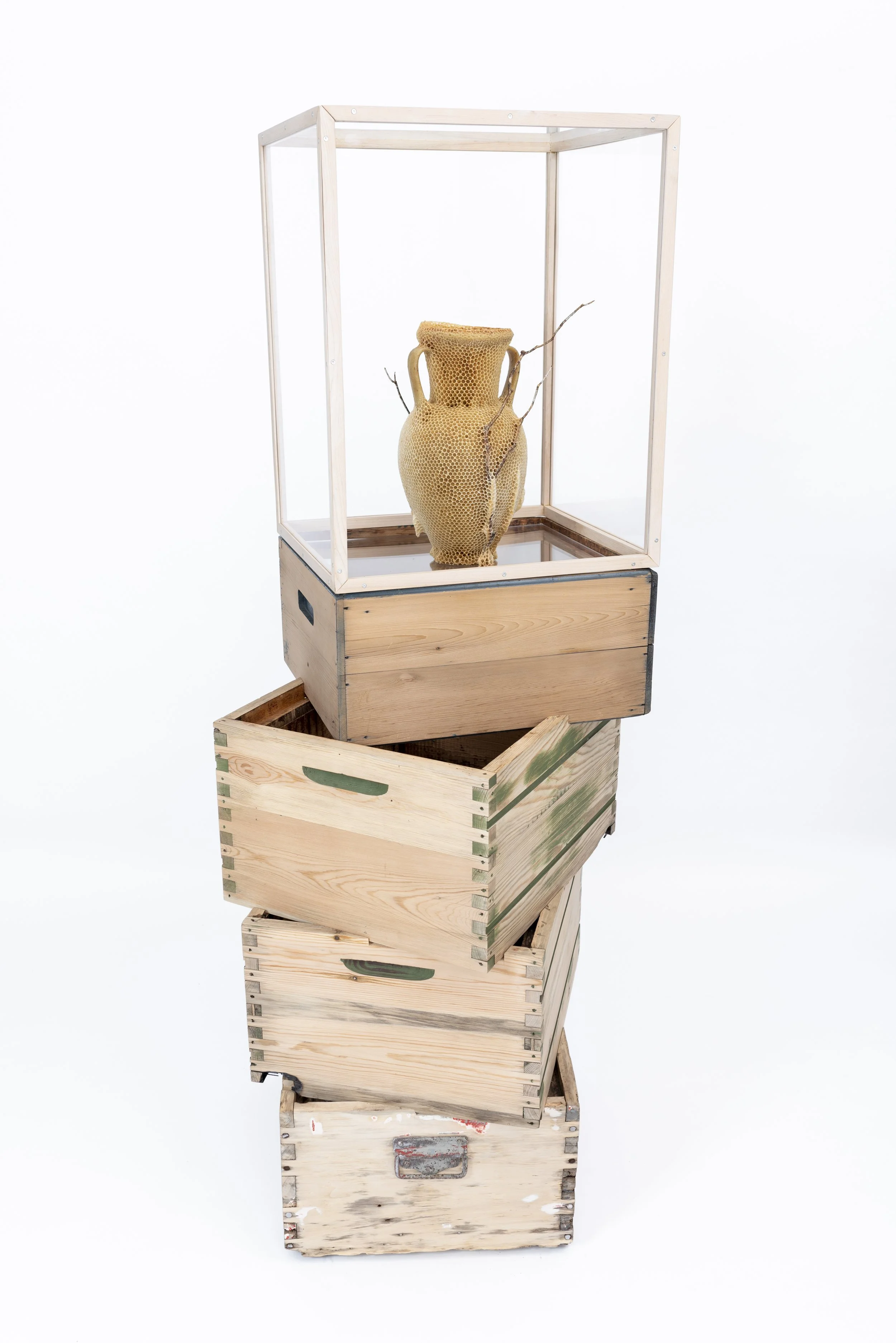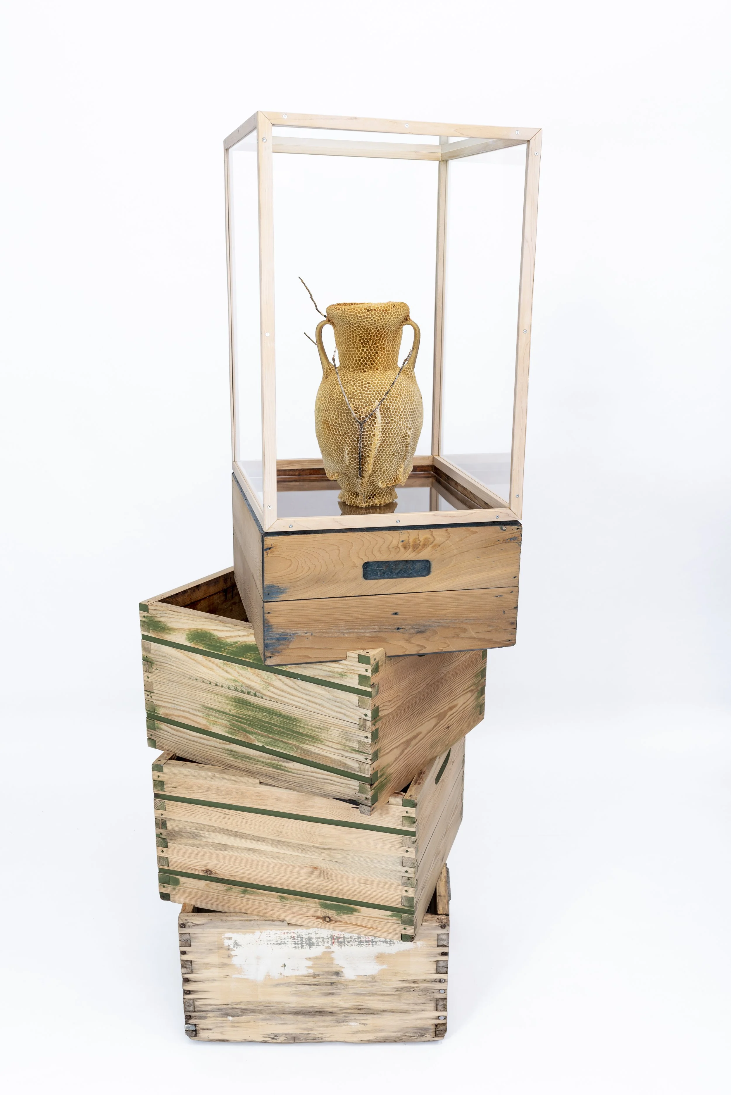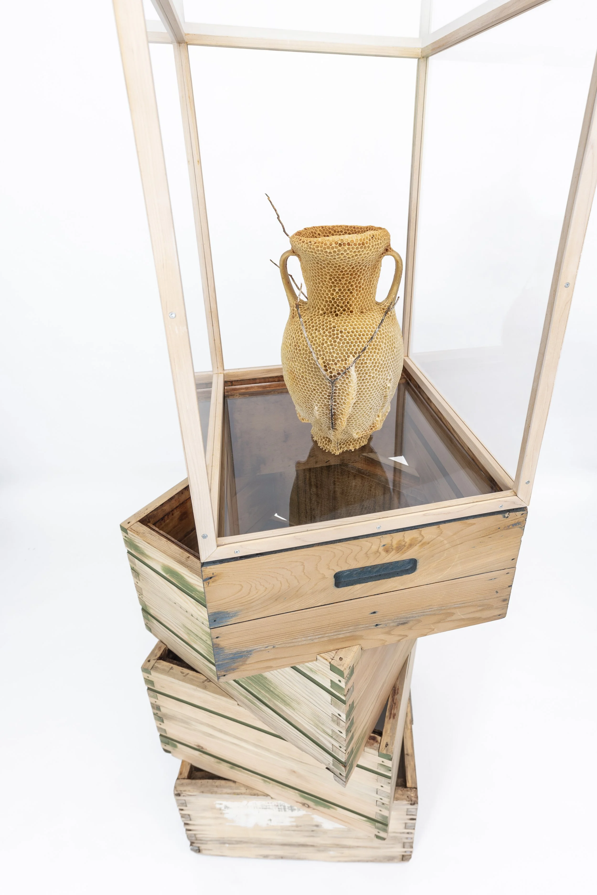 Materials: natural beeswax, wood, museum glass, re-used beehives