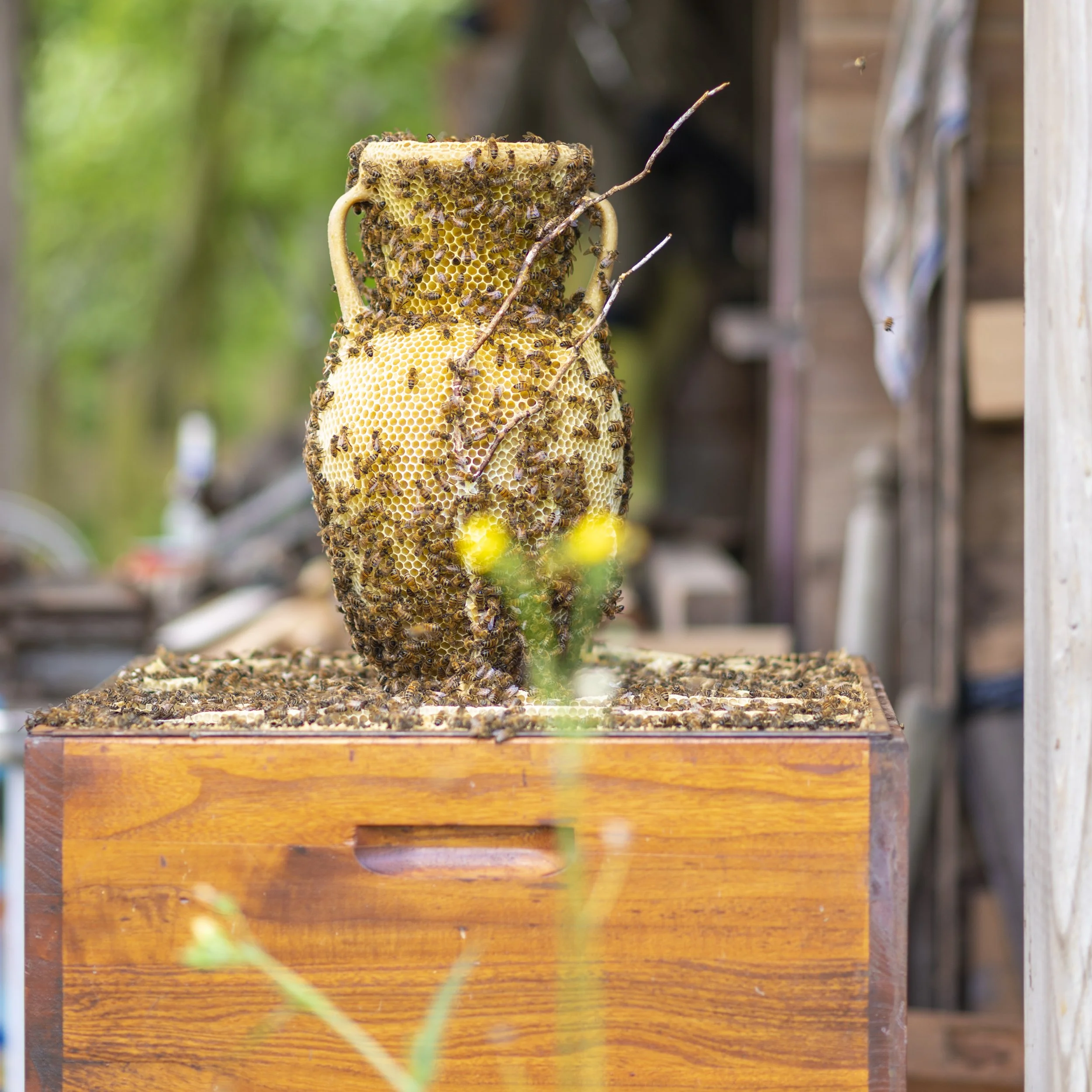 The ancient greeks used amphorae for various purposes besides plain storage of beverages or food. In specific cases they were used for libations, celebration and other social functions. This completely “made by bees” artwork is based on the famous Nolan amphora type from @metmuseum. These featured almost exclusively red-figure ornamentation (warriors, gods, myths and rituals). The column is made of re-claimed and refurbished weathered wooden beehives which are interlocking in various angles. The totem serves both a pedestal as well as an imaginary altar. The beeswax artifact could be seen as a relic. Relic derives from the Latin reliquiae, meaning "remains", and a form of the Latin verb relinquere, to "leave behind, or abandon”. In their succumbing to fate and destiny through work, the bees are saint.